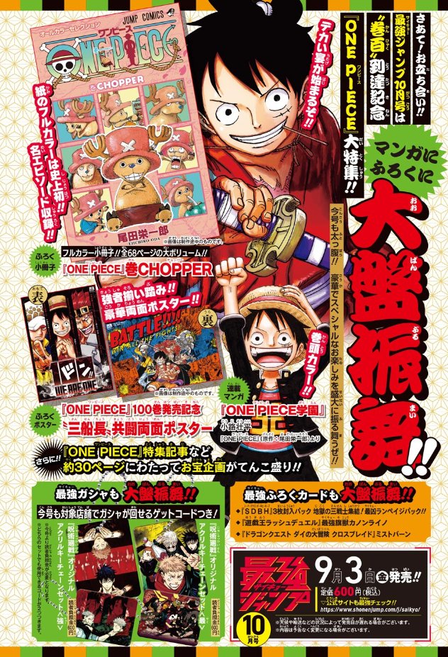 One Piece is a Japanese media franchise created by Eiichirō Oda in 1997 The initial manga, written and illustrated by Eiichirō OdaIt has been serialized in Shueisha's Weekly Shōnen Jump magazine since , and has been collected into 98 tankōbon volumes As of January 21, the manga has sold over 480 million copies worldwide, making it the bestselling manga series inワンピース フジテレビ ワンピース討入り! 受け継ぐおでんの意志 前回の放送日時 21年10月10日 (日) 930~1000 次の放送日時は情報が入り次第掲載いたします。 オフィシャルサイト(外部)はこちら FOD見逃し配信はこちら オロチの首を斬り、新 みなさんにとって、史上最強だと思う『ONE PIECE』の敵キャラは誰ですか? ※「麦わらの一味」の敵となるキャラクターのみを対象 調査方法:gooランキング編集部にてテーマと設問を設定し、gooランキングが提供する投票サービスにてアンケートを行いその結果を集計したものです。